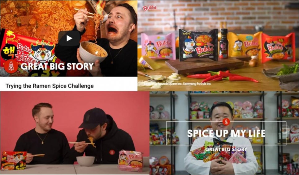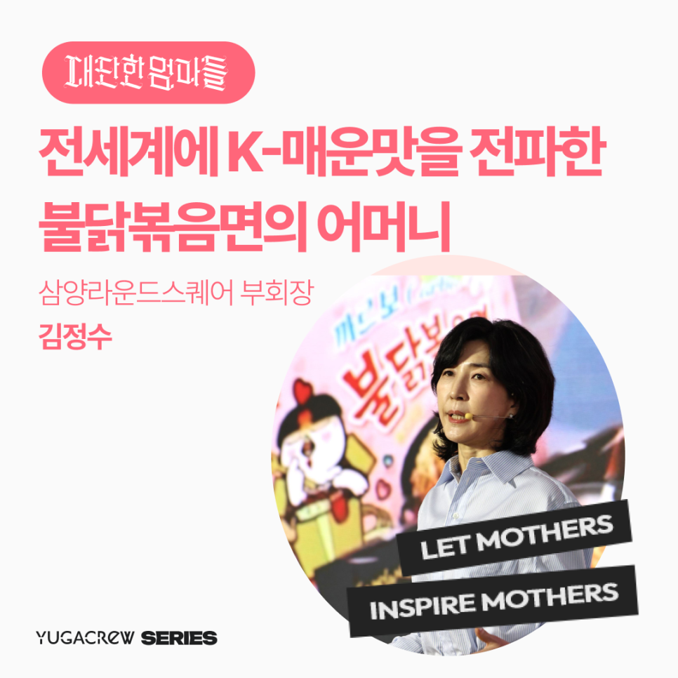 김정수 크루님도 딸의 손을 잡고 나선 명동 거리에서 불닭볶음면의 아이디어를 얻었어요. 당시 고등학생이던 딸과 데이트 겸 들른 명동에서, 사람들이 바글바글한 불닭집을 보고 '사람들이 매운 걸 좋아하는구나.' 라고 생각한 크루님은 바로 각종 양념을 사와 직원들에게 제품을 만들어보자고 했다고 해요. 처음엔 직원들도, 시아버지이자 창업주인 故전중윤 회장도 너무 맵다고 반대했지만 김정수 크루님은 굽히지 않았다고 해요. 김정수 크루님은 '매운맛'의 인기는 무섭도록 대단하고 식지 않으리라는걸 예상하셨던 걸까요? 출시 직후에는 주춤했던 불닭볶음면의 인기는 2014년, 580만 구독자를 보유한 유튜브 스타 '영국남자'가 불닭볶음면을 먹은 런던 사람들의 반응을 영상으로 공개하면서세계적으로 인기를 얻기 시작했어요.