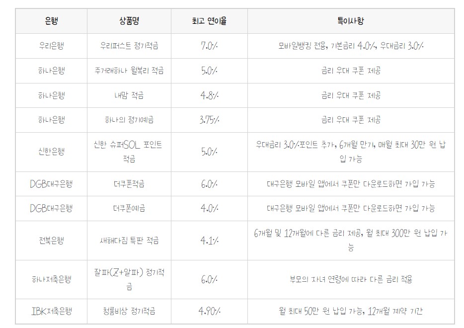 IBK저축은행은 연 4.90%의 '청룡비상 정기적금'을 판매합니다. 월 최대 50만 원까지 납입 가능하며, 계약 기간은 12개월입니다. 기업은행이 선보인 IBK부모급여우대적금도 선착순 만 명까지 최고 7% 우대 금리가 적용됩니다.