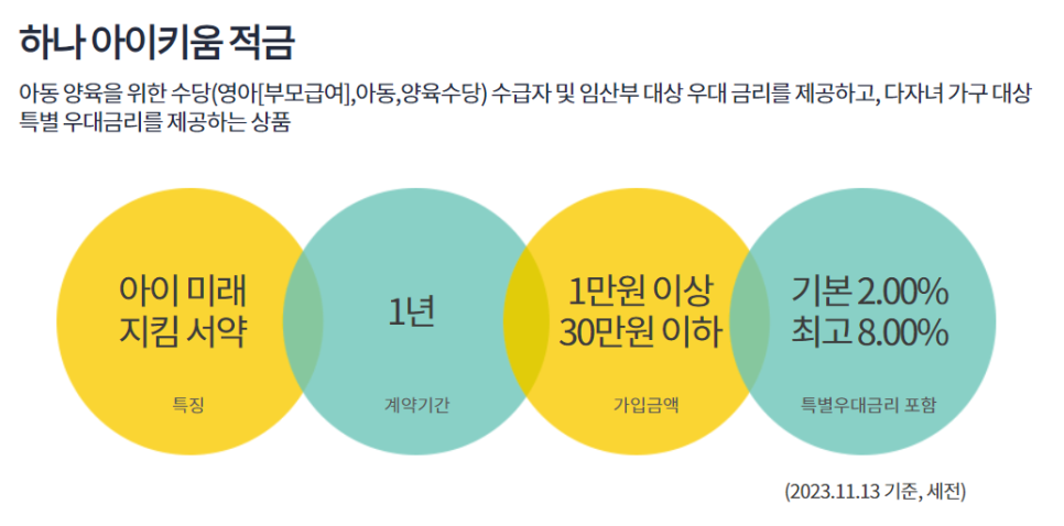 ✔️기간 : 2023.04.25(화) ~ 2024.12.31(화) [5만좌 한정] ✔️가입금액 : 1만원 이상 ~ 30만원 이하 (원단위) ✔️상세 우대금리 조건 : 이 예금 가입후 만기 전전월말 기준, 본인명의 하나은행 입출금통장으로 양육을 위한 수당 (정부 및 지자체가 제공하는 부모급여, 영아수당, 아동수당, 양육수당)을 6회 이상 입금 받은 경우 또는 임산부
