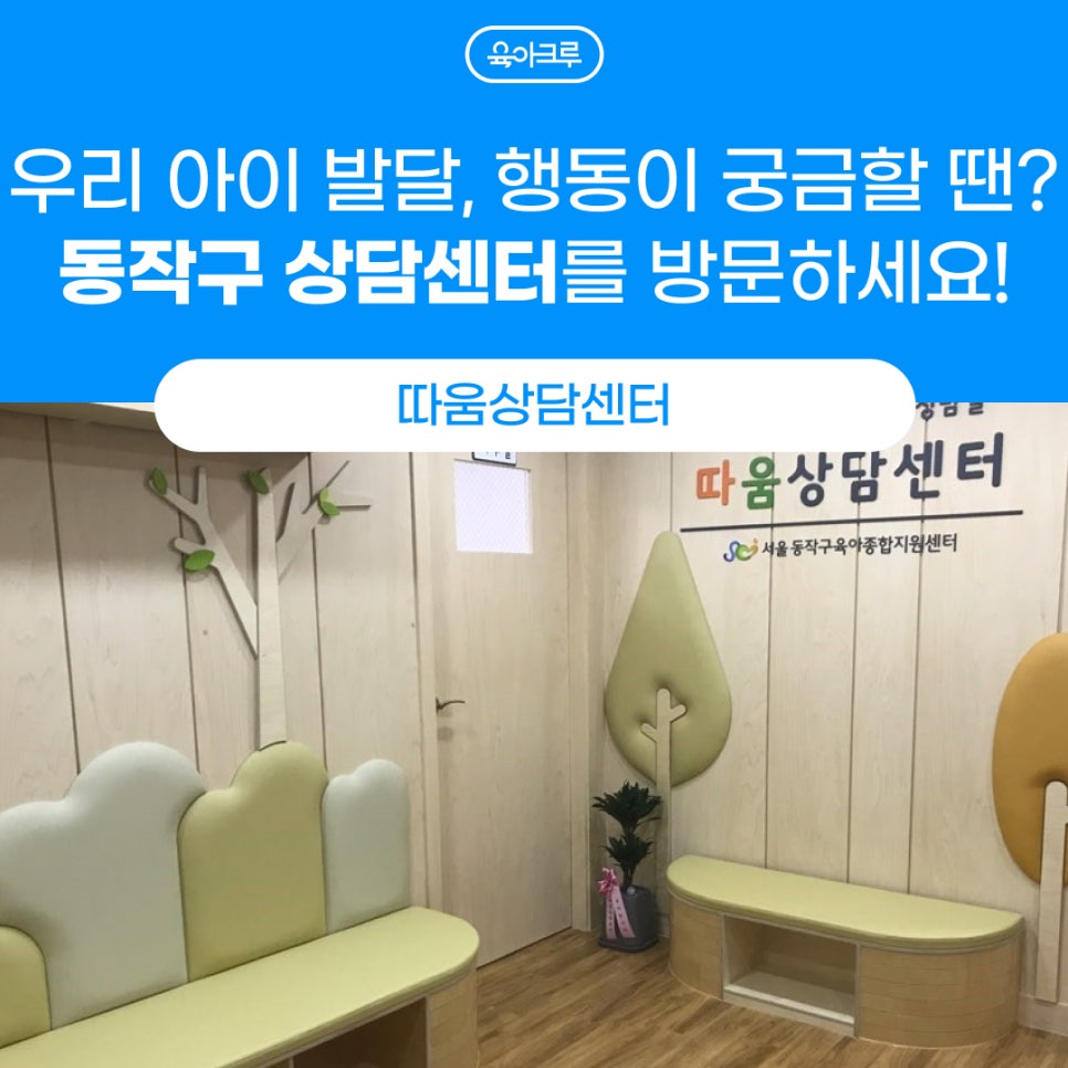 전화번호 02-825-5575 이용시간 월요일 ~ 금요일 : 09:00~ 18:00 토, 일, 공휴일은 휴관 점심시간 12:00~13:00 사진출처 - 동작구육아종합지원센터 동작구육아종합지원센터에서 운영하고 있는 따움상담센터는 동작구 내에서 영유아 및 아동의 발달을 지원하기 위한 전문 상담 기관이에요. 아동의 정서적, 사회적, 인지적 발달을 돕기 위해 다양한 프로그램과 서비스를 제공하고 있어요. 동작구 관내에서 도움이 필요한 영유아 및 아동과 학부모가 이용할 수 있으며 초등학생 6학년까지 이용이 가능하고, 아이들은 보호자를 꼭 동반해야해요. 사진출처 - 동작구육아종합지원센터 따움상담센터는 예약제로 운영되고 있어 이용을 원하는 분들은 전화로 예약 접수를 먼저 하는 것이 우선이랍니다.