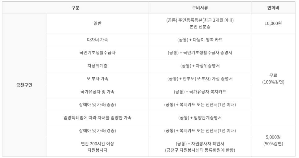 일반 가입자의 경우 주민등록등본과 본인 신분증을 지참해야 합니다. 다자녀 가족의 경우 연회비가 면제되는데요, 다둥이 행복 카드를 꼭 챙겨가세요. 자세한 지참 서류는 아래 이미지를 참고해 주세요!