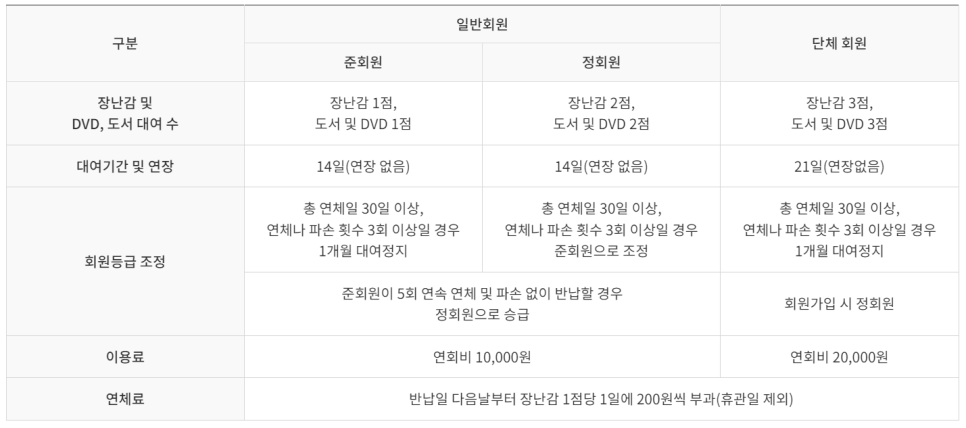 연회비 10,000원을 내면 14일 동안 준회원은 장난감 1개, 정회원은 장난감 2개까지 대여할 수 있어요.