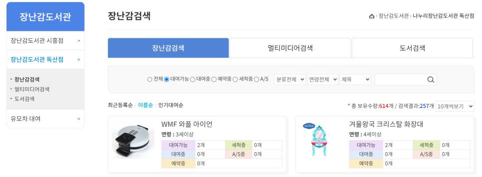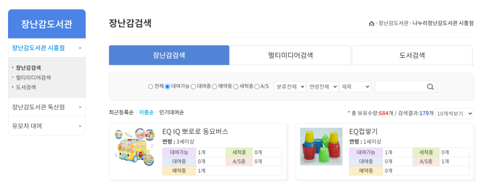 독산점도 위와 동일한 방식으로 현재 대여할 수 있는 장난감을 확인하실 수 있습니다.