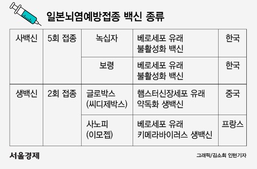 일본뇌염 백신은 불활성화 사백신과 약독화 생백신 두 종류가 있습니다. 사백신은 주사약 속에 면역성을 일으킬 수 있는 바이러스의 일부가 들어있는 백신이고 생백신은 주사약 속에 살아있는 바이러스가 독성이 제거된 채 들어있는 백신입니다. 과거 우리나라에서는 사백신만 판매했으나 2002년 중국에서 생산된 생백신이 국내 판매허가를 받았습니다. 따라서, 사백신이나 생백신 모두 안정성 및 유효성 측면에서 국내에서 사용이 가능한 백신입니다. 그러나 교차접종은 권장하지 않습니다.