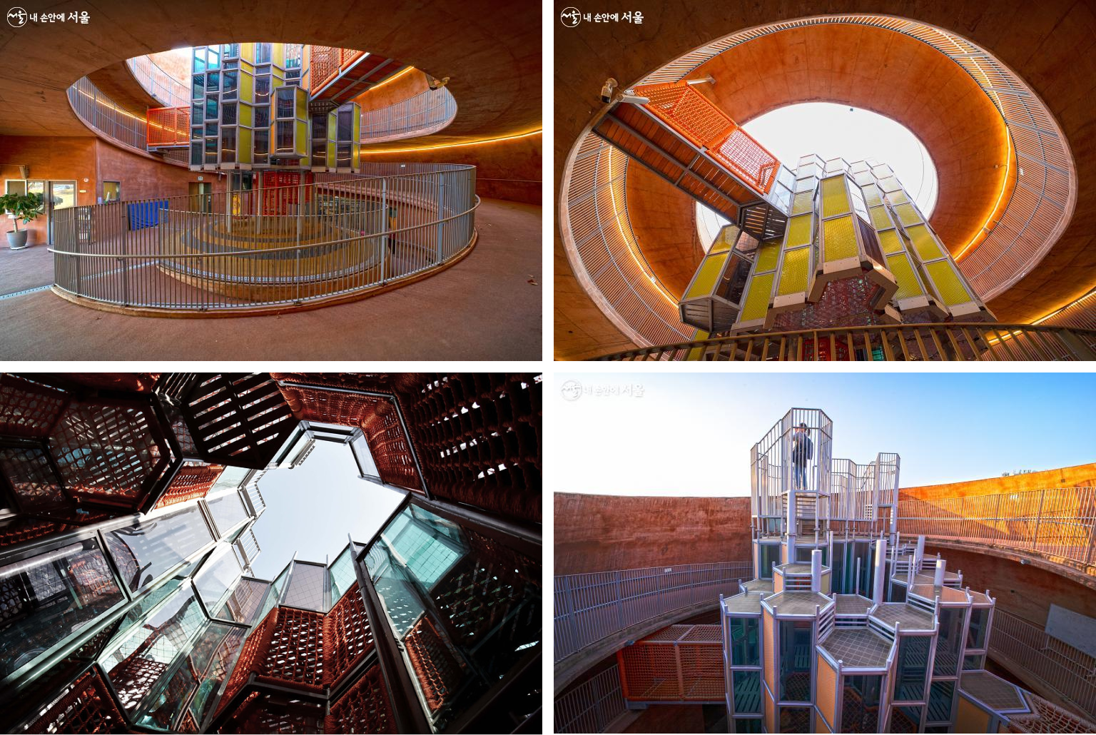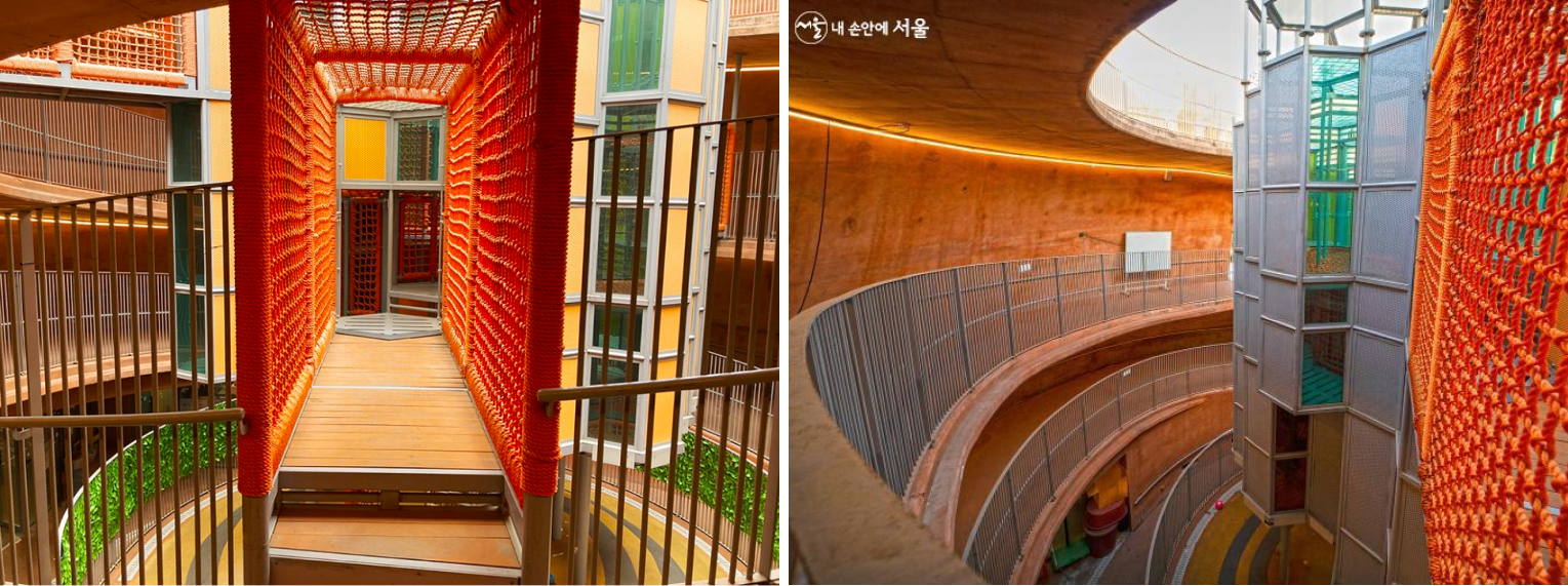 이렇게 거대한 정글짐 보신 적 있으신가요? 골무 모양의 건물 내벽을 따라 100m 길이 뱅뱅이길을 오르다보면 산마루 놀이터의 시그니처 정글짐을 만날 수 있어요! 9m 높이를 자랑하는 초대형 정글짐으로 아이들에게 인기만점이에요.