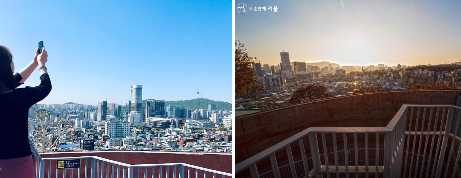 정글짐의 정상에 오르면 마주할 수 있는 서울의 풍경인데요, 뻥 뚫린 시원한 뷰가 스트레스를 확 날려주네요👍 저 멀리 남산타워를 비롯해 동대문과 창신동 일대의 풍경이 한눈에 보이고 특히 해가 지는 일몰시간에 맞춰가면 멋진 서울의 노을과 야경을 볼 수 있는 건 크루님을 위한 꿀팁! 🌄
