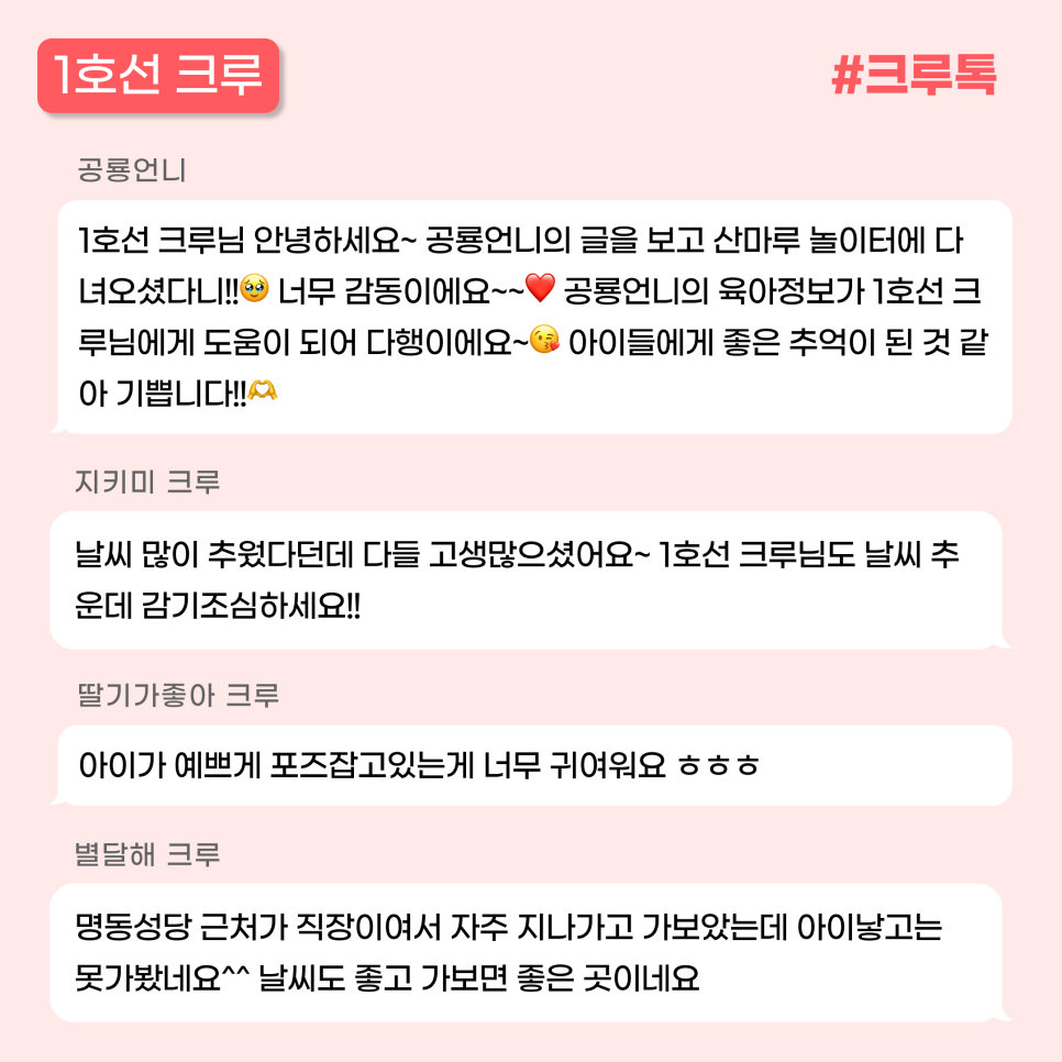 육아크루의 크루톡에는 1호선 크루님의 글처럼 아이랑 명동, 아이랑 축제 등 아이랑 가볼만한 곳은 물론 육아맘, 육아대디의 리얼 육아일상이 가득하답니다. 육아친구들과 나누고 싶은 이야기와 정보를 육아크루 크루톡에서 함께 공유해요 💖 아이랑 함께 가기 좋은 곳, 육아 궁금증, 일상 소통까지! 언제든 육아크루 크루톡을 찾아주세요 ❣️