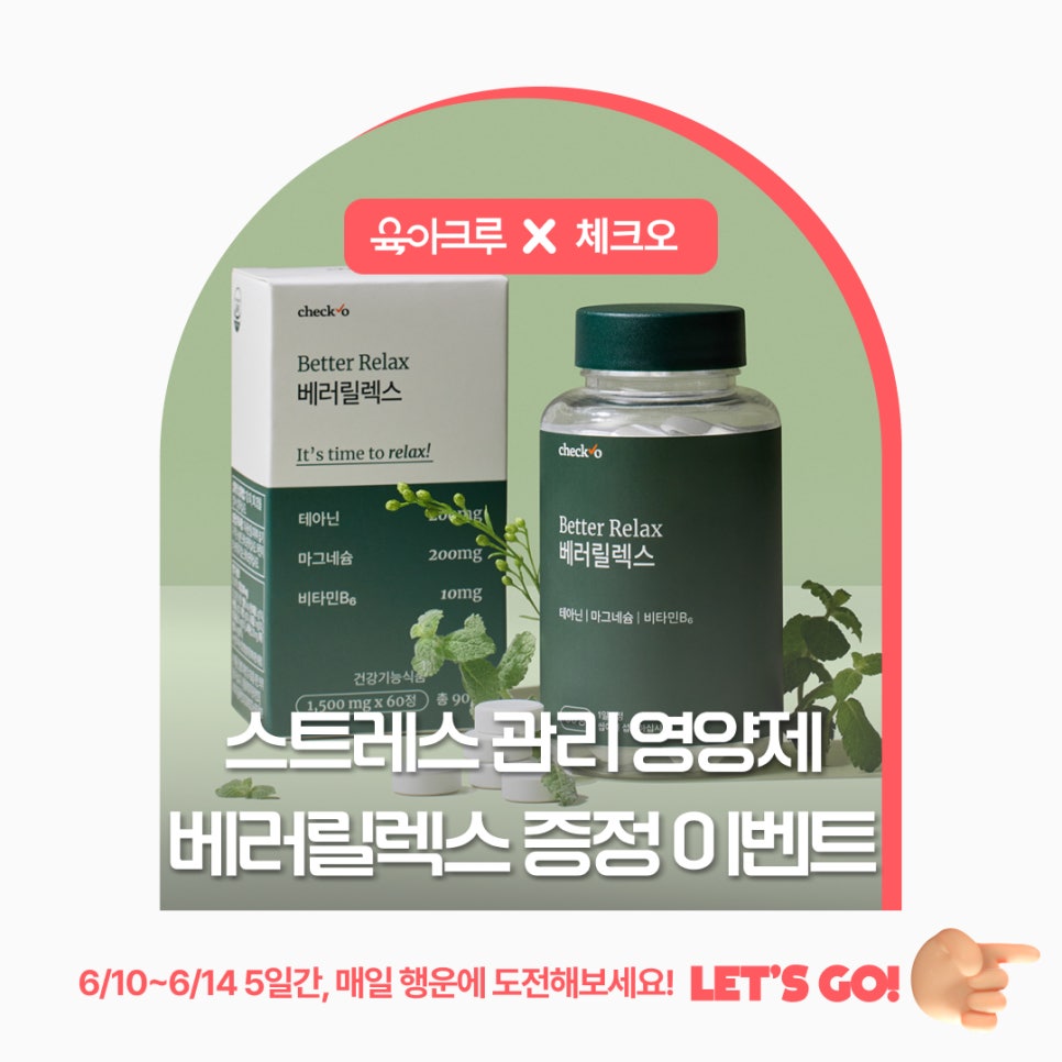 6/10 ~ 6/14에는, 매일 오전 11시에 응모하면 추첨을 통해 베러릴렉스를 증정하는 이벤트를 진행했는데요 1일 권장 섭취량이 함유된 테아닌과 마그네슘, 비타민 B6까지 챙길 수 있는 스트레스 영양제랍니다. 👉베러릴랙스 이벤트 원데이크루 보러가기(클릭) 벨리팝 물병, 룸스프레이, 여성청결제 등 소개한 두가지 외에도 다양한 제품을 크루님들을 위해 무료 증정하기도 했는데요. 앞으로도 많은 이벤트를 진행할 예정이니 많은 관심과 성원 부탁드려요!