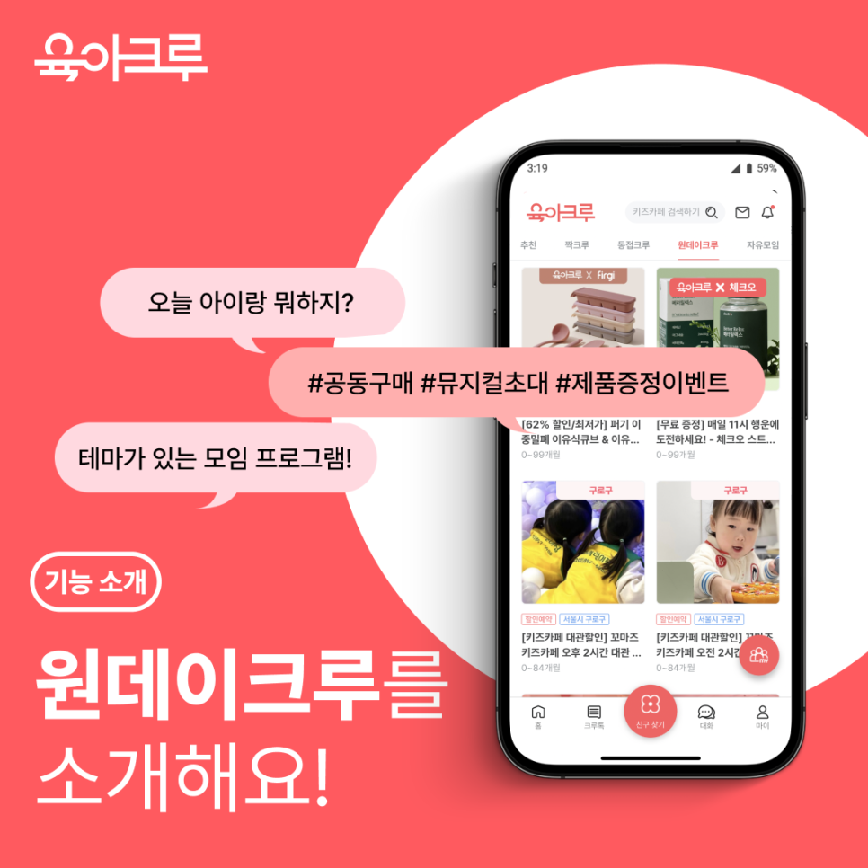 원데이크루에서는 이런 것들을 하고 있어요! 키즈카페 할인, 육아용품 공동구매, 제품 증정 이벤트, 뮤지컬 초대까지 테마가 있는 소모임 육아크루 원데이크루 구경하기