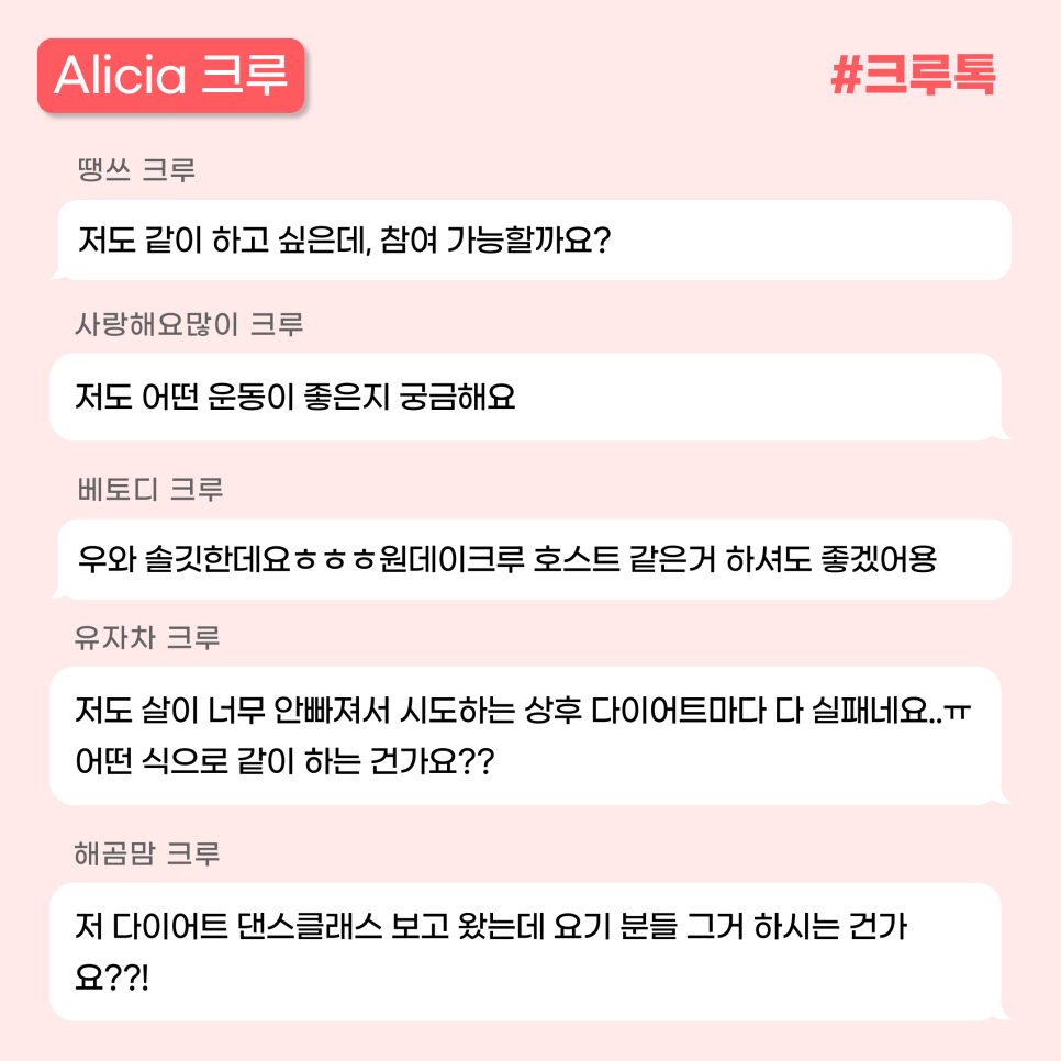 벌써 네 번째 이야기! 이번에 소개해드릴 크루님은 Alicia 크루님이에요. 임신 전부터 출산까지 눈에 보이는 가장 큰 변화는 아무래도 몸무게이죠! 🤣 변화한 체형에 충격을 먹었던 Alicia 크루님은 크루톡에서 다이어트를 의지를 내보이며, 함께할 다이어트 크루를 모집하셨는데요! 수줍었던 Alicia 크루님의 첫인사부터, 결연하게 산후 다이어트를 다짐한 글까지! Alicia 크루님의 크루톡을 소개해드릴게요.