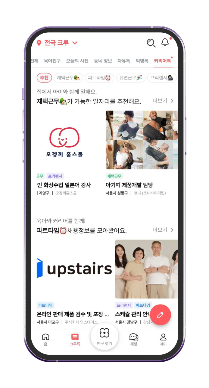 육아크루 앱 내 커리어톡은 육아와 병행할 수 있는 일자리들을 맞춤으로 큐레이션하여 보여주고 있어요. 파트타임, 재택근무, 집 주변 채용공고 등 육아맘들에게 꼭 필요한 육아&여성친화적인 채용정보를 동네별로 제공하고 있어요. 이번 협약을 통해 육아크루와 중부여성발전센터는 양질의 일자리 정보, 취창업 교육정보를 더욱 많은 분들에게 소개하고 좋은 시너지를 내고자 하는데요. 육아크루 앱을 활용한 엄마들을 전문역량강화 교육 및 채용공고 홍보 진행하고자 하니 많은 관심과 뜨거운 성원 부탁드립니다!