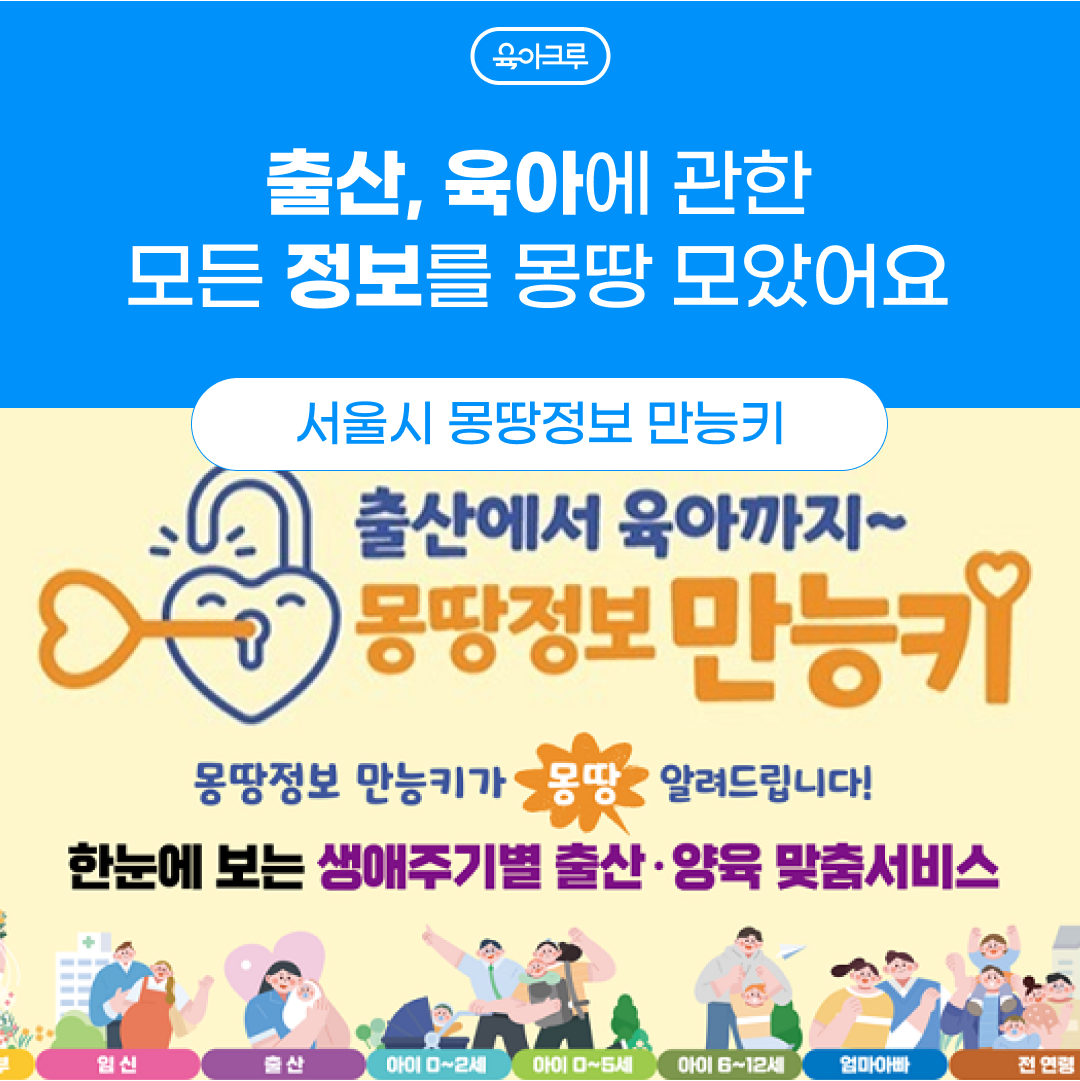 몽땅정보 만능키는 출산에서 육아까지 다양한 정보와 정부 지원 서비스를 한 번에 확인할 수 있는 통합 플랫폼입니다. 그동안 출산·육아 관련 정보를 찾기 어려워서 헤매던 엄마 아빠들의 높은 관심과 호응을 받고 있습니다. 중앙부처·서울시 등 여러 곳에 흩어져 있는 임신·출산·육아 관련 정보를 한곳에 모아 편리하게 볼 수 있고, 주요 서비스도 신청할 수 있어 매우 편리합니다👍👍