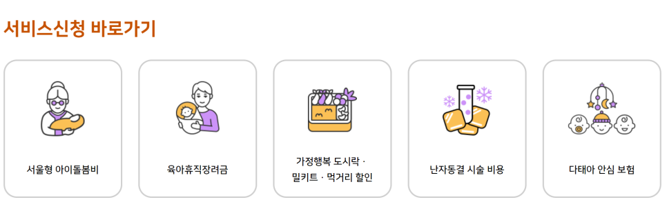이처럼 서울시 몽땅정보 만능키에서는 서울형 아이돌봄비 육아휴직장려금 가정행복 도시락, 밀키트, 먹거리 할인 난자동결 시술 비용 다태아 안심 보험 등의 서비스를 신청하실 수 있습니다.