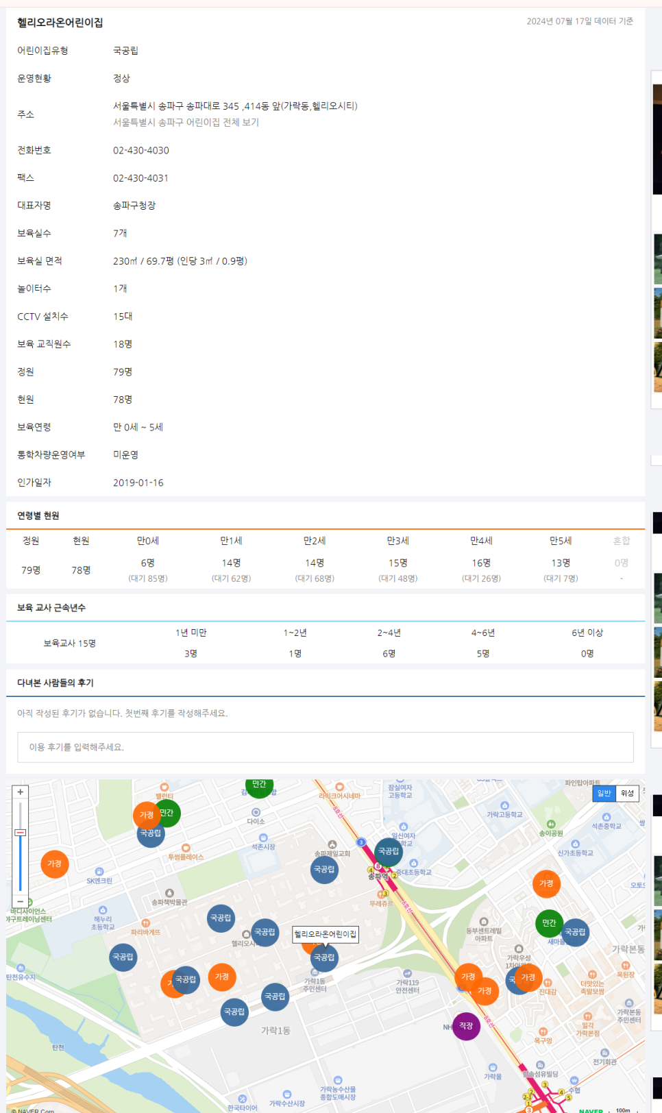 정보를 원하는 유치원을 클릭하면 정원이 몇명인지, 보육실이 몇개인지부터 교직원의 수부터 통학차량 여부 등 다양한 어린이집의 기본 정보를 볼 수 있어요. 어린이집 대기 수도 확인할 수 있어 아이 어린이집 계획을 세우는 분들에게도 참고할 수 있는 사이트라는 생각이 들어요.