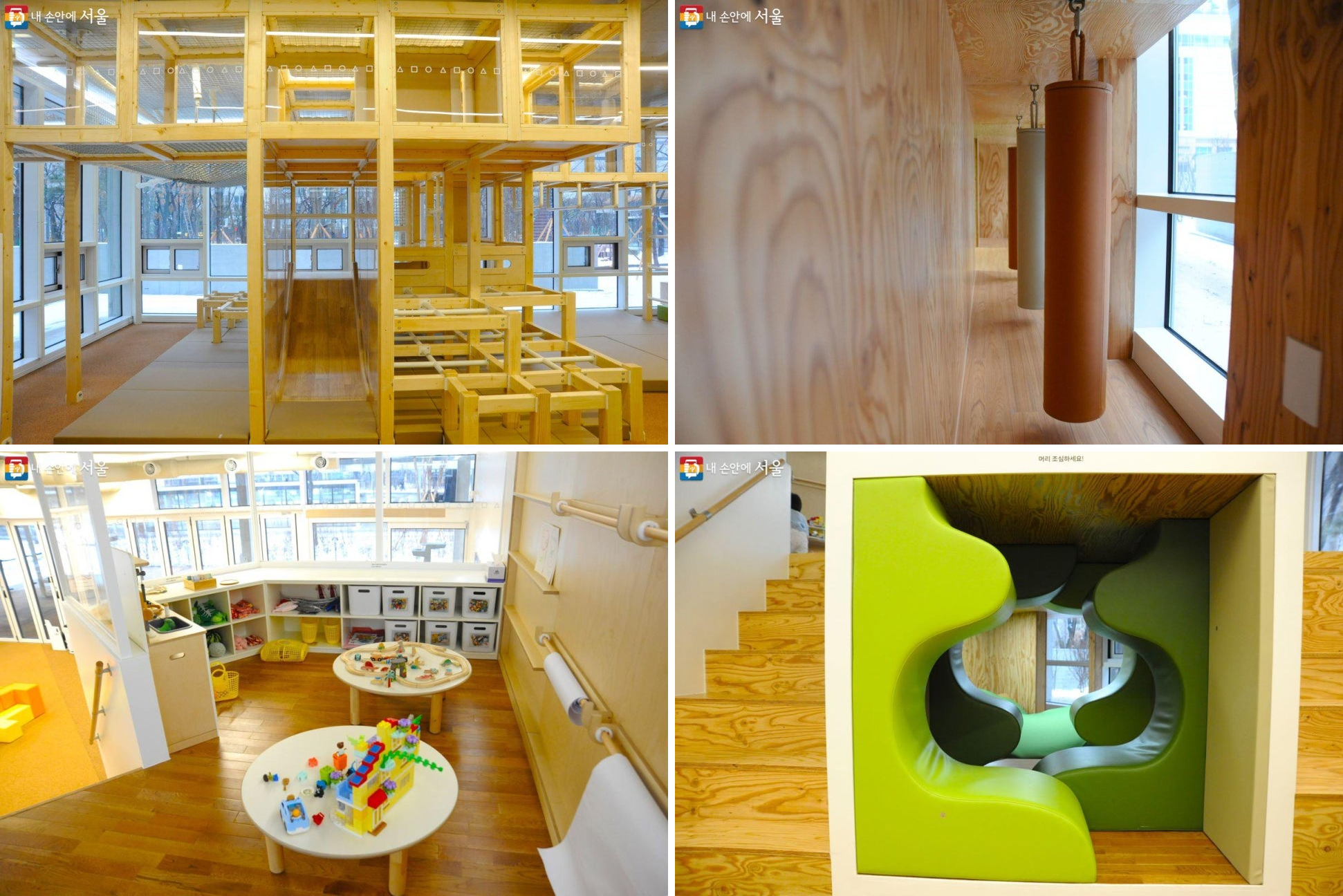 (사진 출처 - 내 손안에 서울) 이 키즈카페는 복층 구조물로 놀이공간이 구성되어 있답니다! 나무를 이용한 정글짐과 계단 아래 공간을 활용한 놀이시설과 쉼터. 그리고 아이들이 제일 좋아하는 다락방 형식의 놀이공간까지! 다양한 놀이공간으로 구성되어 있어 아이들의 상상력과 흥미를 자극할 수 있는 키즈카페 같아요~